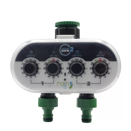 A Rain Pressure Zero otthoni használatra tervezett elemes csapvezérlő. Működéséhez nincs szükség nyomásra, ezért kiválóan alkalmas tartályról való gravitációs öntözés vezérléséhez. Egy rendkívül megbízható és hosszú távon stabil, kiegyensúlyozott teljesítményt nyújtó termék. Ez a vezérlő típus 2 zónás kivitelben kapható. A hozzá tartozó szűrővel és gumitömítéssel ellátott 3/4"-os csatlakozójának köszönhetően a legtöbb kerti csapra felszerelhető. A külső 3/4"-os kimeneti pontjára a hozzá tartozó gyorscsatlakozó segítségével kerti tömlő, egy átalakító segítségével akár csepegtető szalag vagy csepegtető cső is csatlakoztatható. Kezelése roppant egyszerű, átlátható felületének köszönhetően mindenki könnyedén megértheti, hogy hogyan kell beállítani a programokat. 2 db 1,5 V-os AAA ceruzaelem helyezhető el benne (nem tartozék), melyek garantálják az egész szezon alatti működést. Az öntözés 1, 2, 3, 4, 6, 8, 12, 24, 48, 72 óránként vagy 7 naponta indítható el 1, 3, 5, 10, 15, 20,  30, 60, 90 vagy 120 perces futási idővel egyszerűen kezelhető forgókapcsolók segítségével.