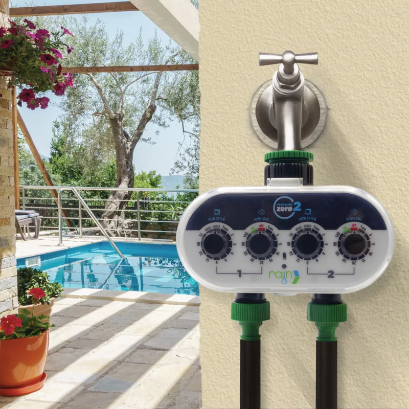A Rain Pressure ZERO egy 2 zónás elemes csapvezérlő. Elsősorban kisebb kertek, virágoskertek vagy virágládák öntözésére kifejlesztett megbízható automatika. Programozása rendkívül egyszerű, úgy lett megtervezve, hogy a beállításokat bárki elvégezhesse rajta.