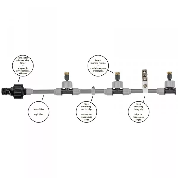 A szorítóelemekkel a párásítót a sátorhoz, pavilonhoz vagy akár a teraszhoz is rögzíthetjük. A párásító készlet egy gyorscsatlakozó segítségével csatlakoztatható a vízhálózathoz, kerticsaphoz. Üzemi nyomás 3-6bar. Vízfogyasztás max. 16 liter/óra.